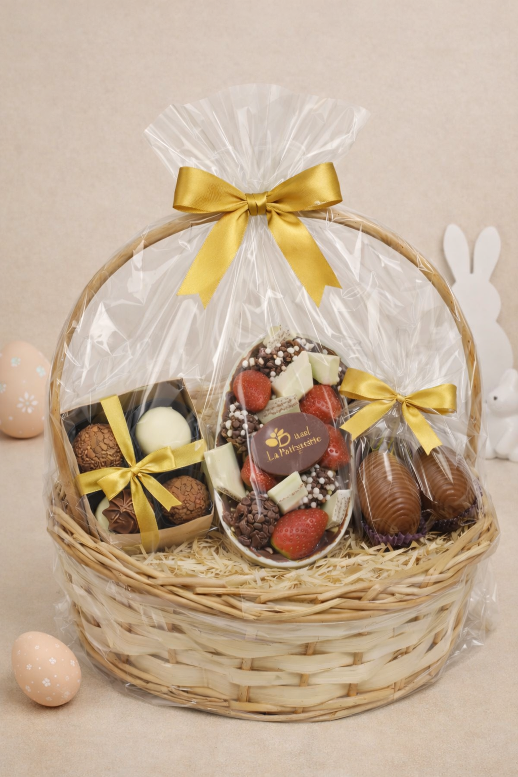 Cesta exclusiva com principais itens de Páscoa: Ovo Gourmet, Colomba Pascal, Caixa de Doces e Bombons
